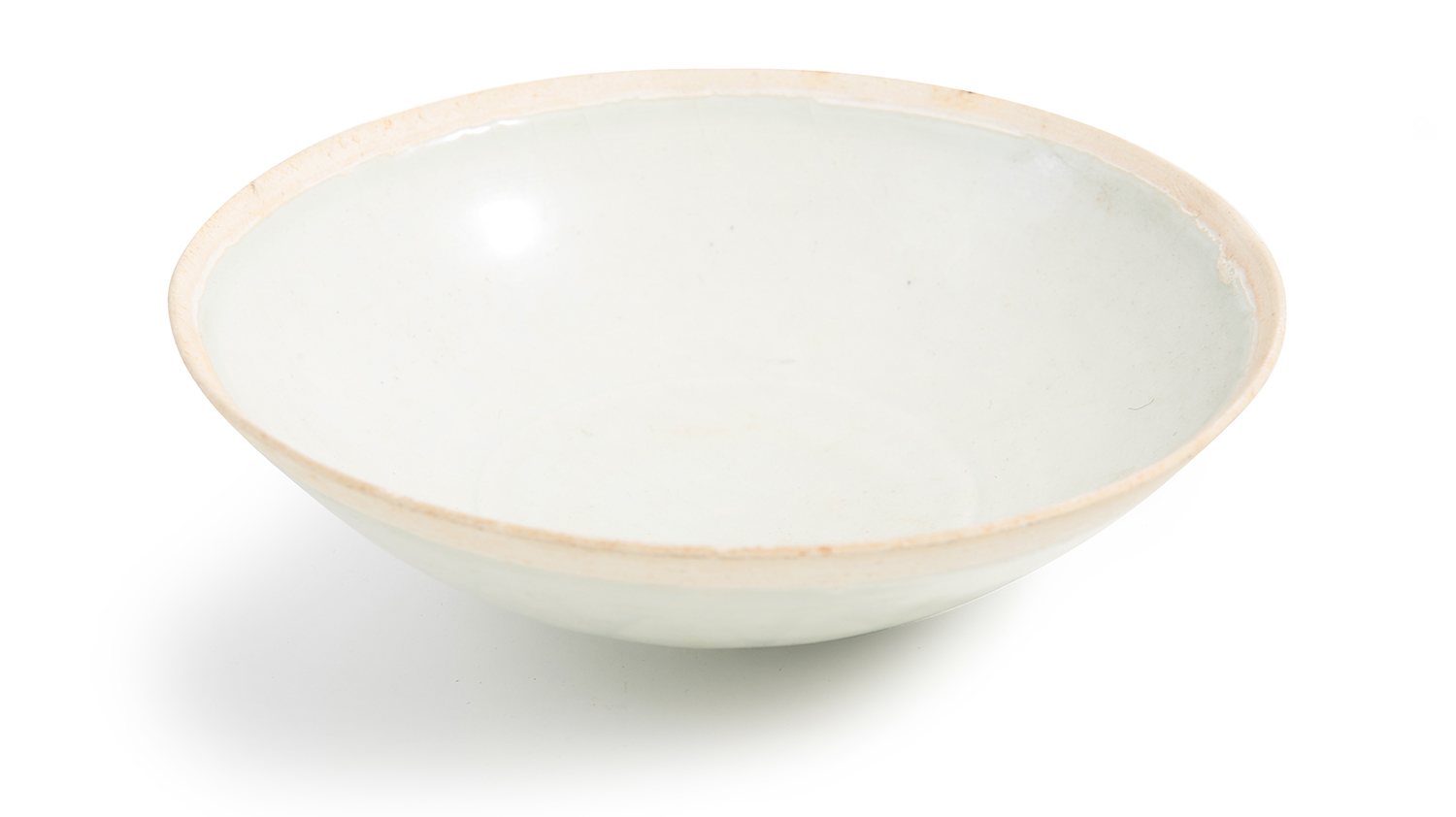 The thinly potted bowl with a small footrim, and an unglazed mouthrim, with carved decoration of lotus petals to the exterior, covered in an even pale blue glaze.