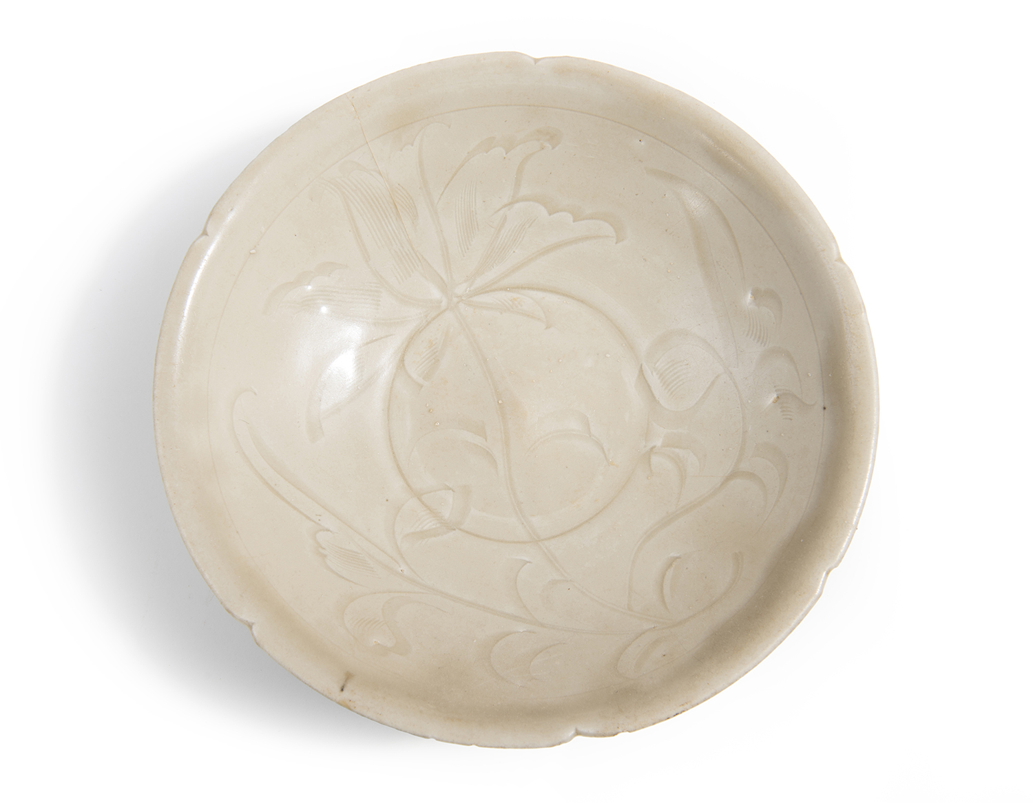 The foliate-rim bowl well carved to the interior with a lotus blossom with foliage, covered with a yellow-olive coloured celadon glaze. The base within the footrim unglazed.