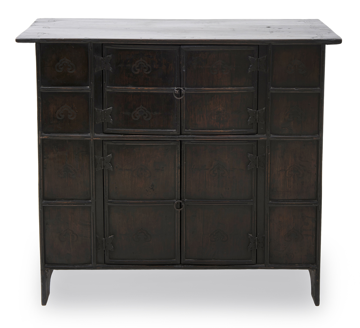 The dark lacquered hardwood chest from the traditional Korean house men's quarters, with two sets of doors, the door panels and side panels decorated with carved ruyi design, with original iron hardware mounts.
