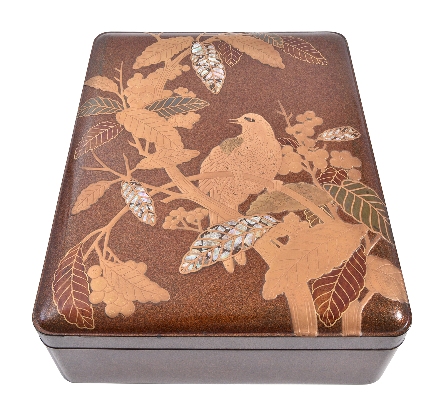 Large document box featuring design of a bird perched on a branch amongst leaves and fruit in gold hiramakie (low relief) and aogai (mother of pearl) lacquer on a dense nashiji (pear skin) ground.