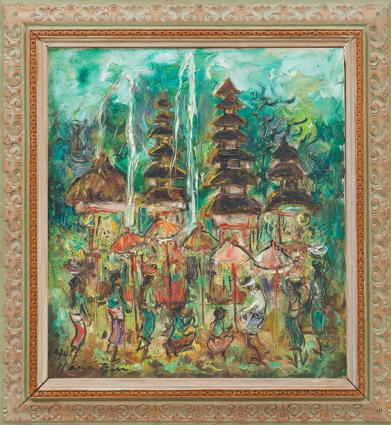 Depicting a colourful festival scene in front of a Balinese temple, with rice paddies behind. signed lower left and dated 1974. In original carved Balinese wooden frame.