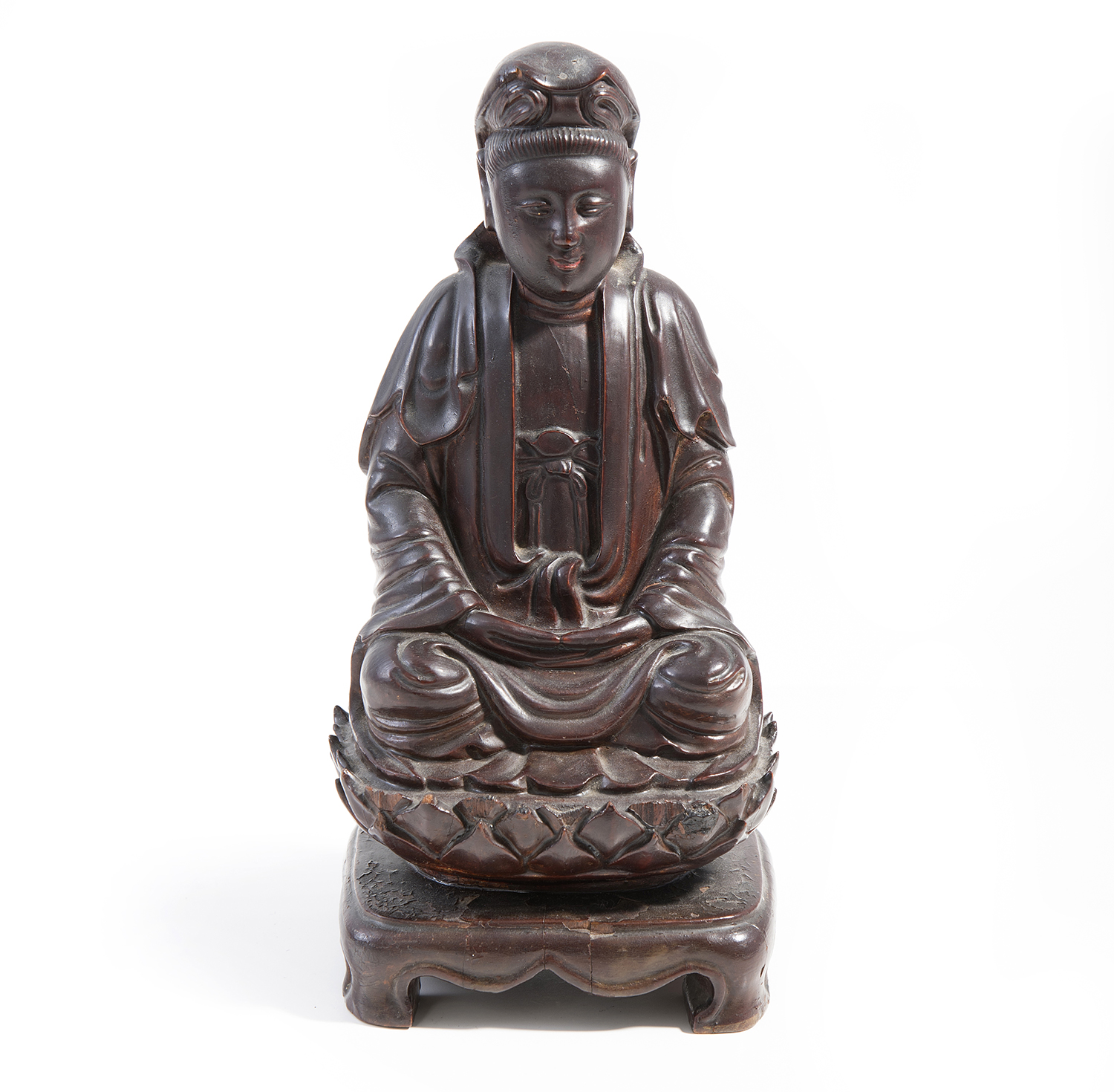 Some chips to the tips of the lotus petals of the lotus base, cracking and small losses to the lacquer finish, particularly to the back of the figure. Evidence of possibly having been relacquered a very long time ago. Discolouration to the lacquer. Some general wear and scrathes to the lacquer finish. The original square plug at the back sealed and unopened.