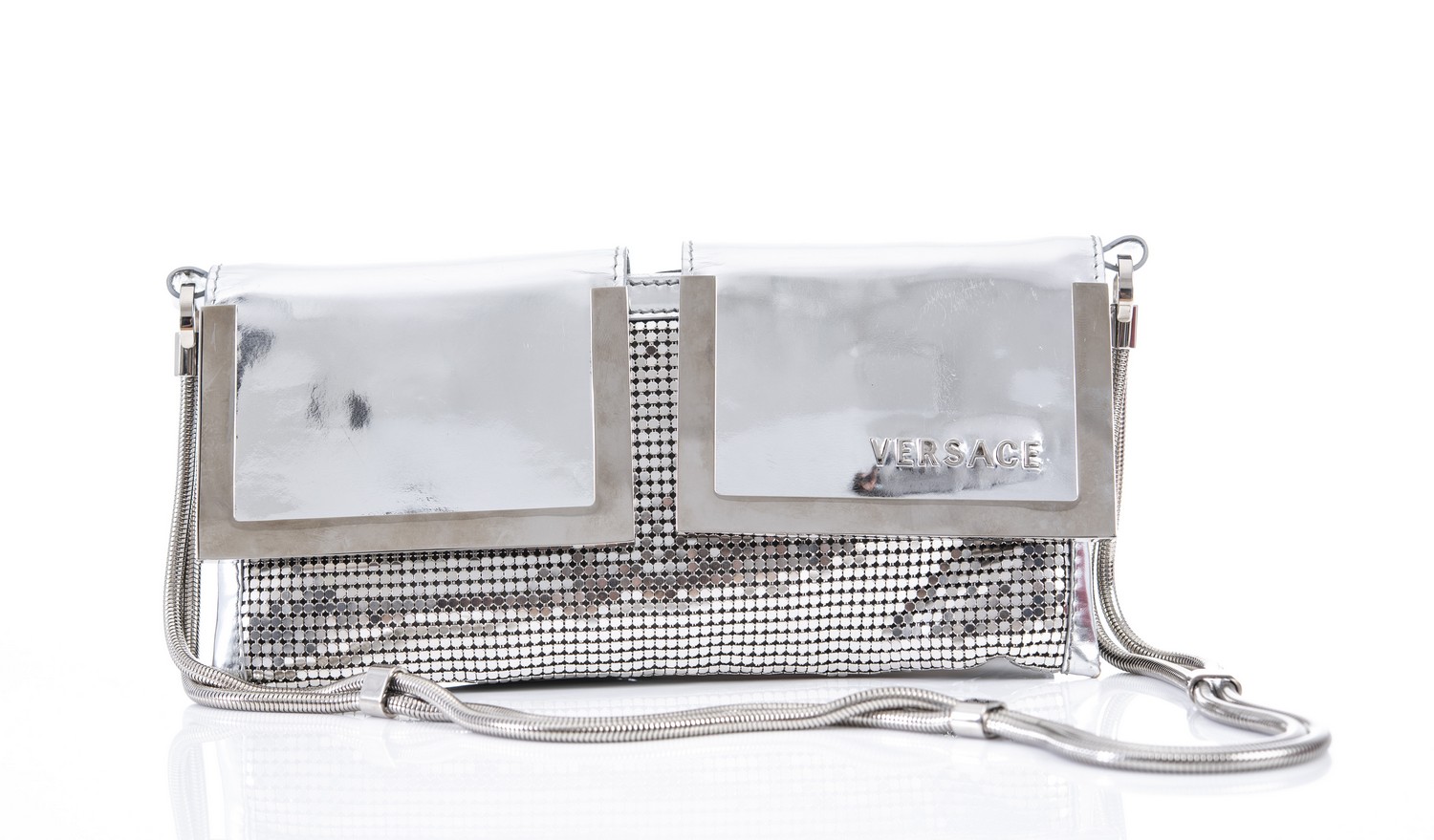 Styled in silver mesh and patent leather with detachable shoulder strap, 12 x 23cm