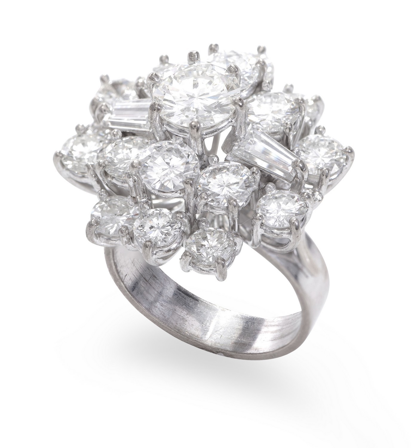 Of snowflake design, centrally set with a principal round brilliant cut diamond weighing 1.40cts, surrounded by round brilliant cut and tapered baguette diamonds totalling 5.60cts, in platinum and 18ct white gold, ring size N.
