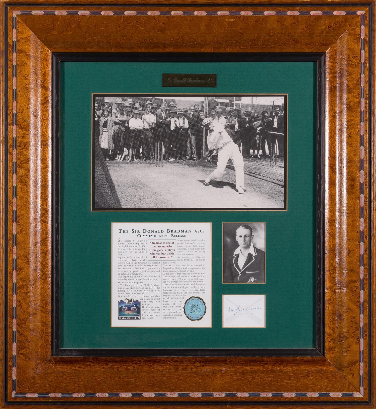 A FRAMED SIR DONALD BRADMAN COMMEMORATIVE RELEASE BY THE BRADMAN MUSEUM AND LEGENDS MEMORABILIA, WITH DON BRADMAN SIGNATURE