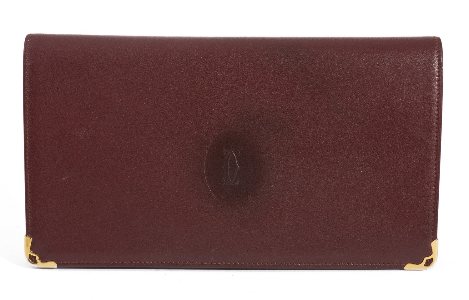 Styled in maroon leather with gold metal capped corners and Cartier emblem embossed to front, 10.5 x 19cm.