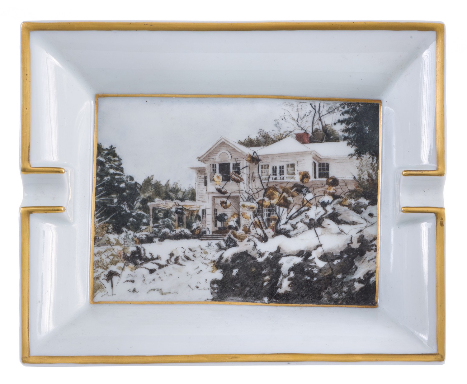 AN ASHTRAY BY HERMES, HAVING A SNOW SCENE DESIGN, 20 x 16cm.