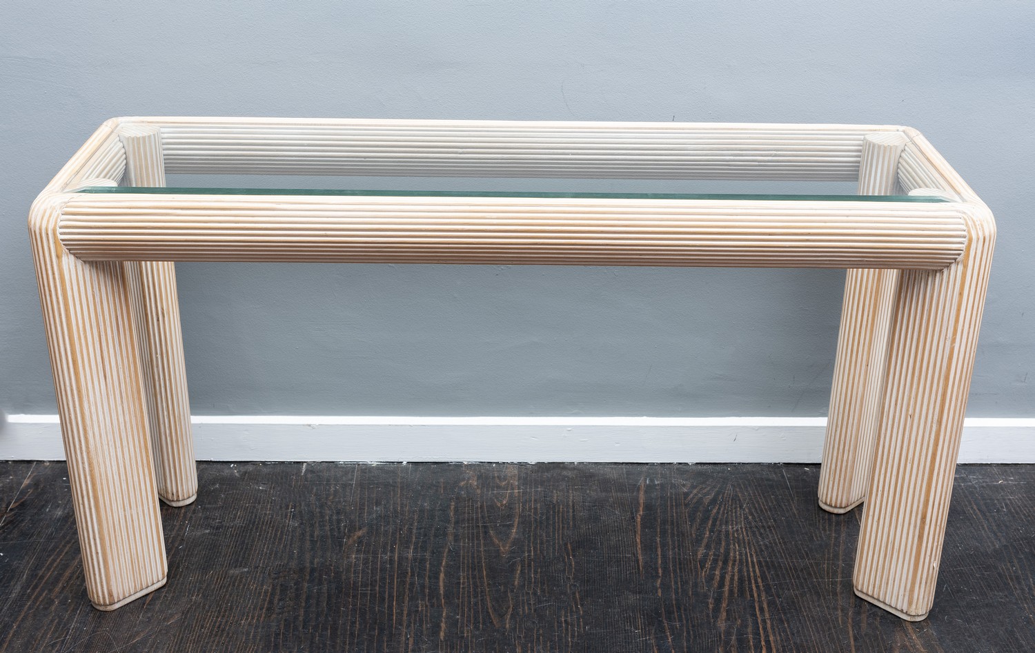 A PROVINICIAL STYLE LIME WASHED HALL CONSOLE WITH GLASS TOP
