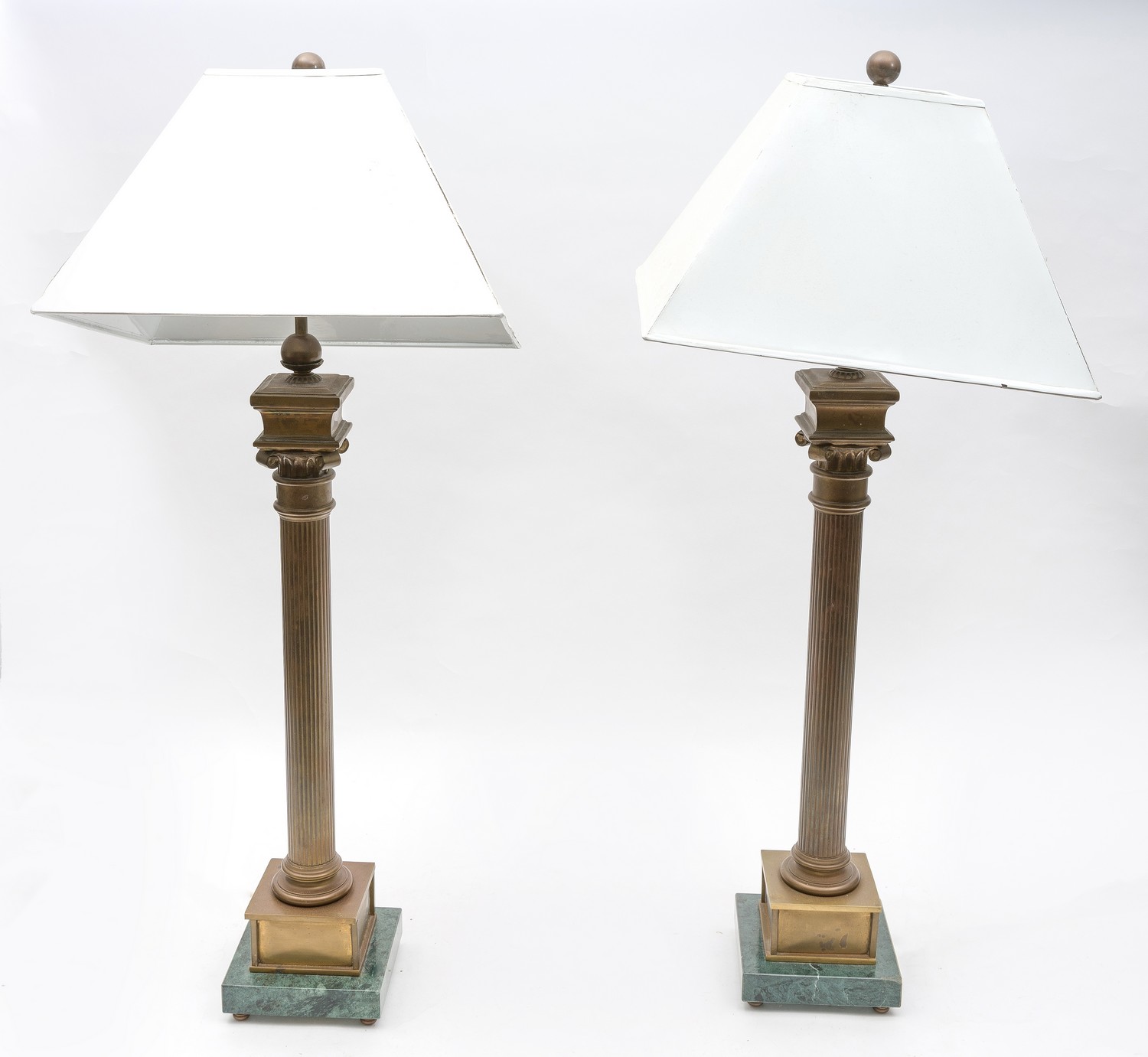 A PAIR OF CLASSICAL IONIC STYLE BRONZED LAMPS