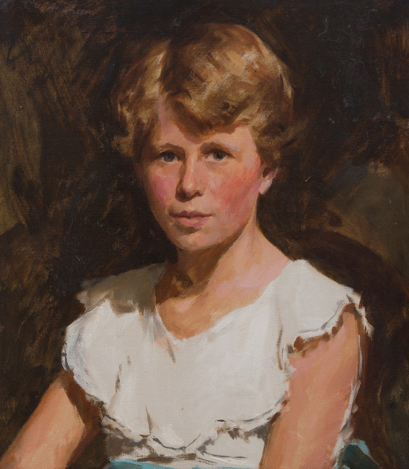 ARCHIBALD DOUGLAS COLQUHOUN, PORTRAIT OF PIXIE SKASE AS A YOUNG GIRL, 1953, OIL ON CANVAS, 49 X 44CM