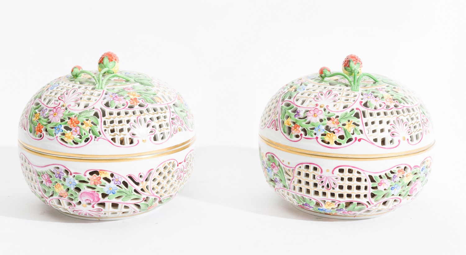A PAIR OF HEREND PIERCED LIDDED CONTAINERS WITH FRUIT AND FLORAL MOTIFS