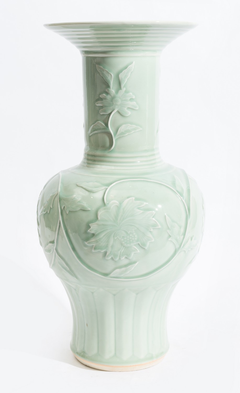 A CHINESE CELADON VASE WITH FLORAL MOTIFS
