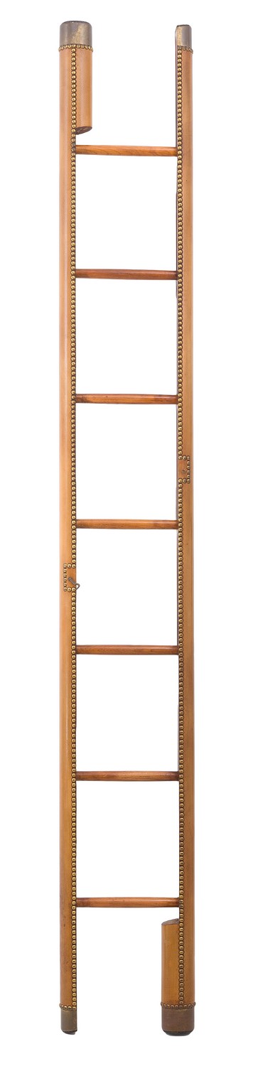 A VINTAGE RETRACTABLE LIBRARY LADDER, ACQUIRED MID 1980s FROM HERMES, 500 COLLINS STREET, MELBOURNE, WITH TAN LEATHER COATED WOODEN FRAME, BRASS FITTINGS AND STUDS, LENGTH 260CM