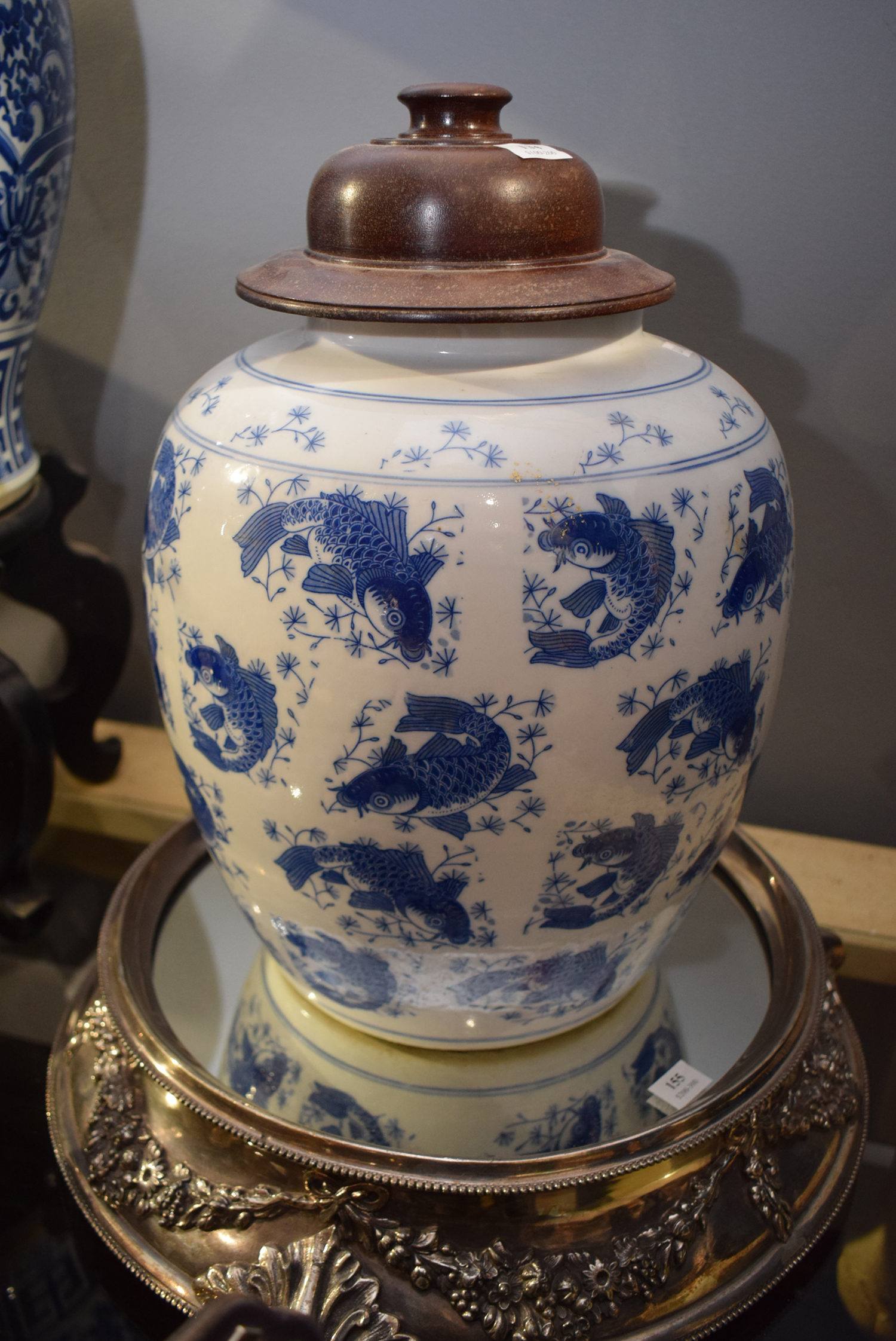 A BLUE AND WHITE CHINESE GINGER JAR WITH FITTED WOODEN LID