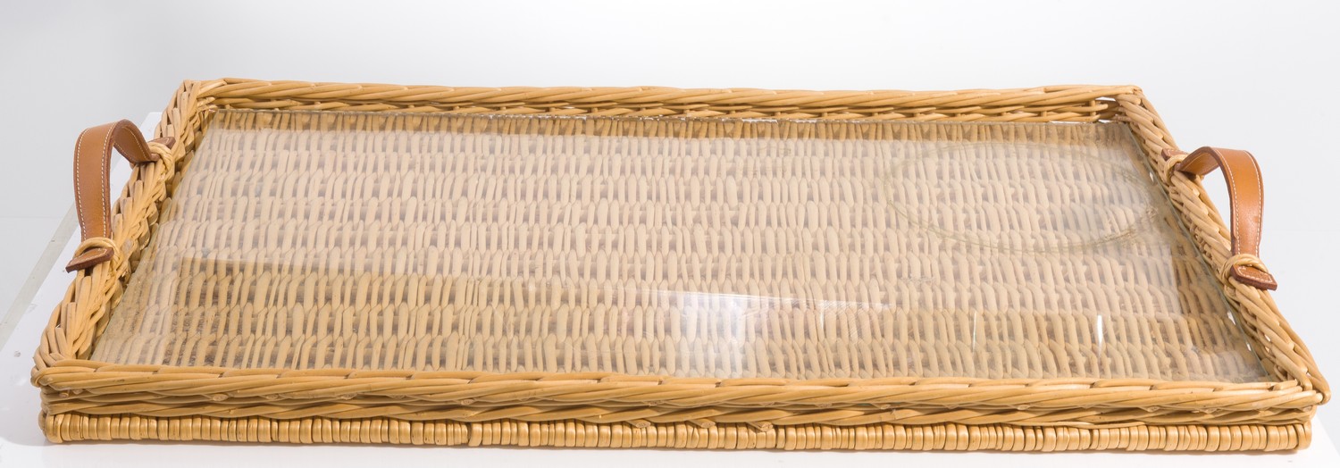 A WICKER TRAY BY HERMES, WITH GLASS BASE AND SIGNED LEATHER HANDLES, 60 X 40CM.