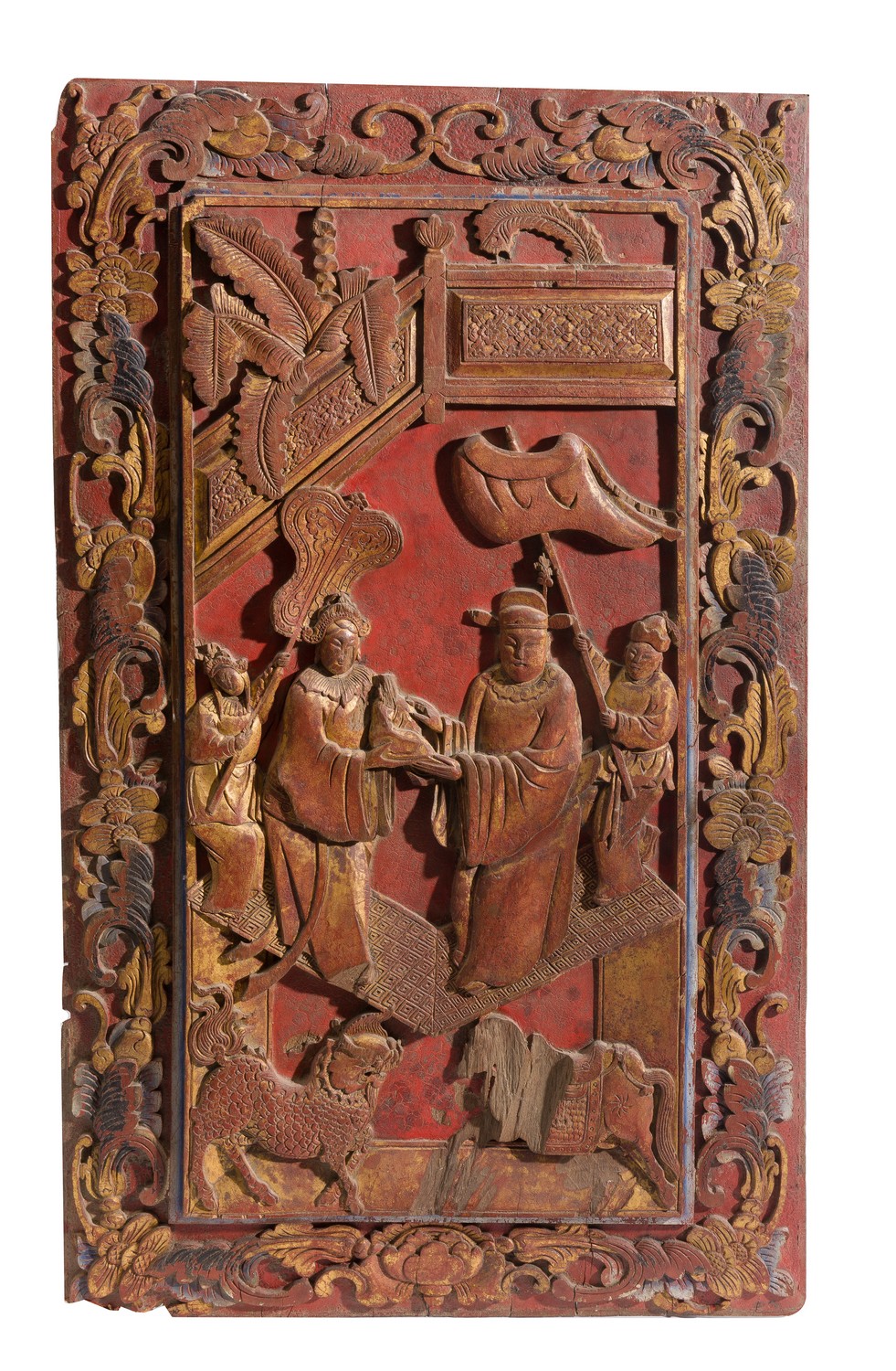 A CARVED ASIAN POLYCHROME AND WOOD PANEL WITH CEREMONIAL SCENE