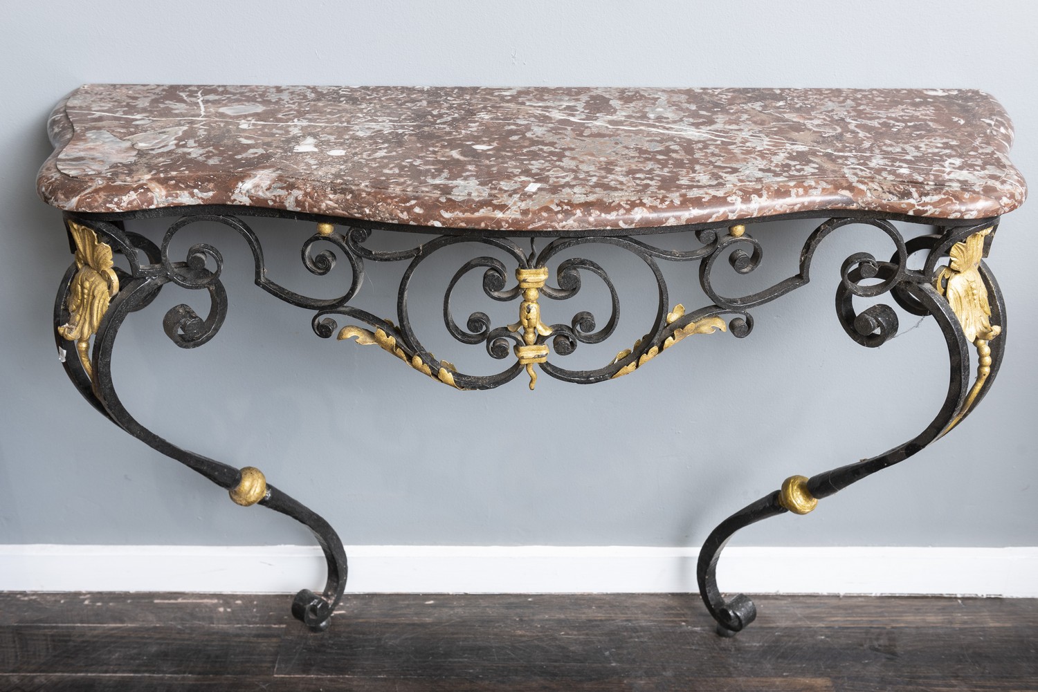 A MARBLE TOP CONSOLE ON DECORATIVELY GILDED WROUGHT IRON BASE