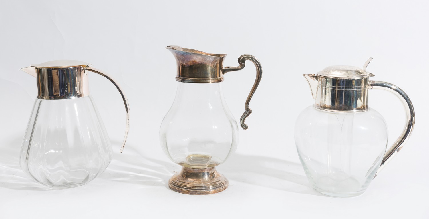 THREE EARLY 20TH CENTURY ICED TEA JUGS. ICE CHAMBERS MISSING (A/F)