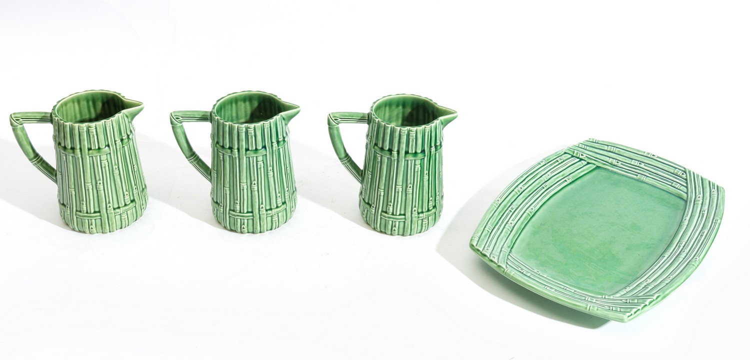 A SET OF THREE PORTUGUESE BAMBOO MOTIF JUGS AND MATCHING TRAY