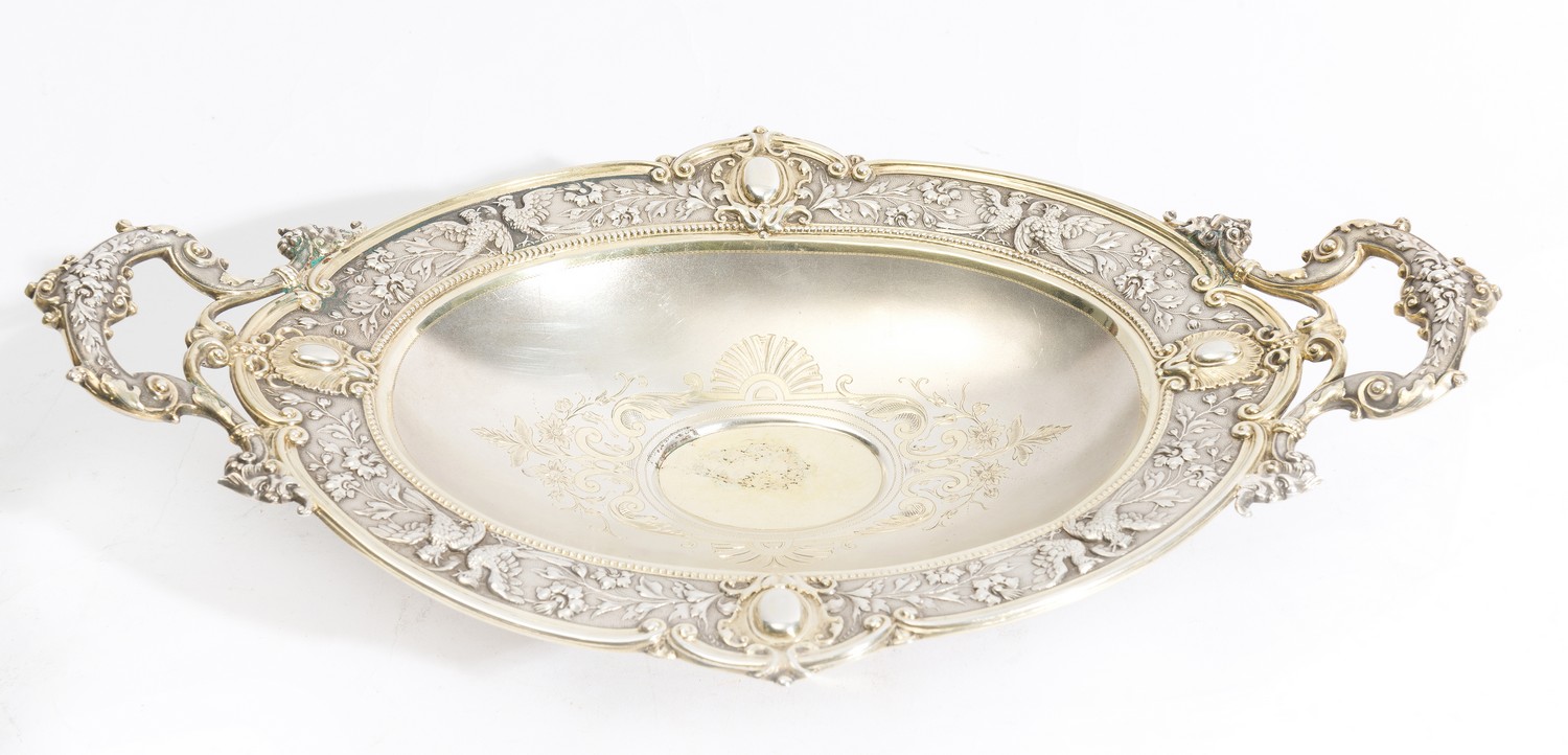 A CONTINENTAL SILVER DISH WITH BIRD AND GILT DETAIL