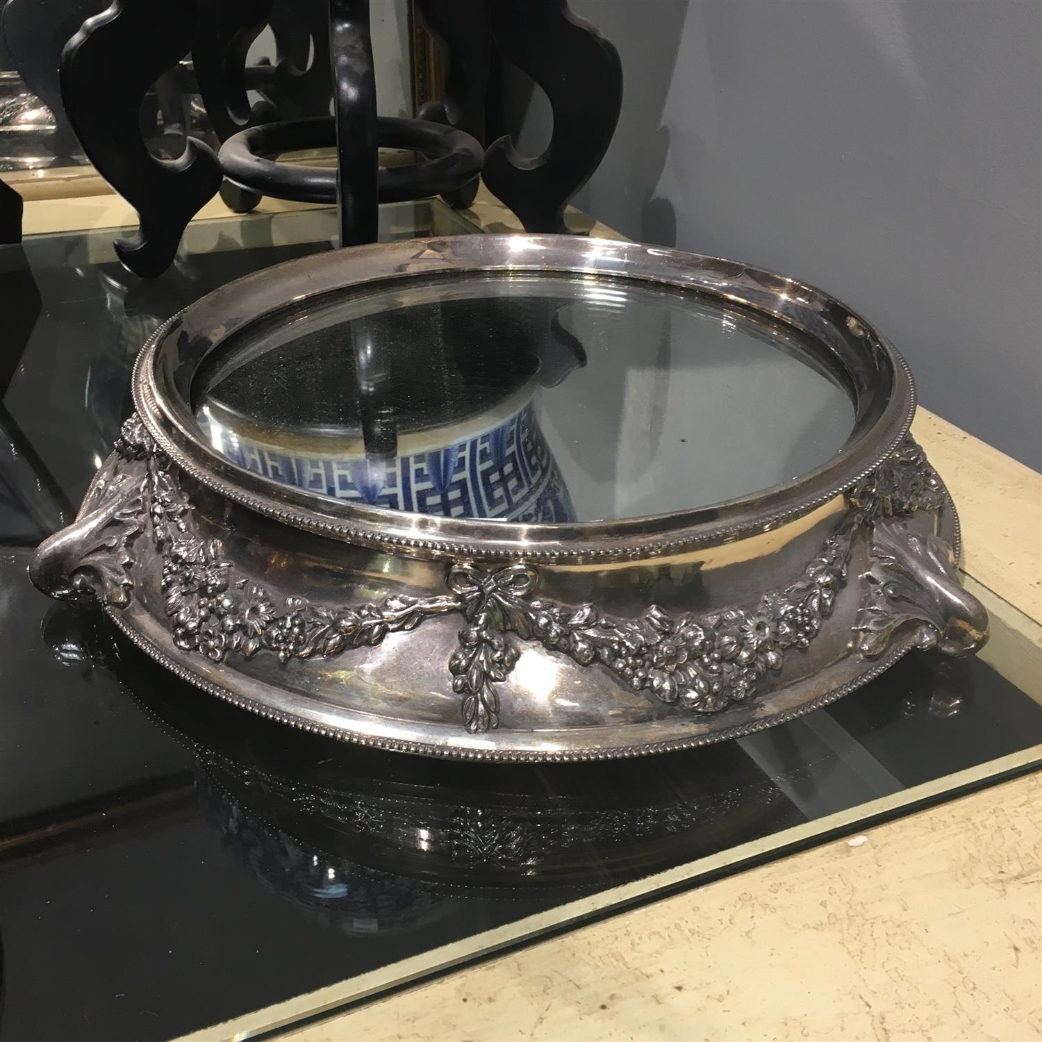 A SILVERPLATE AND MIRROR EPERGNE BASE WITH ACANTHUS AND GARLAND DECORATION