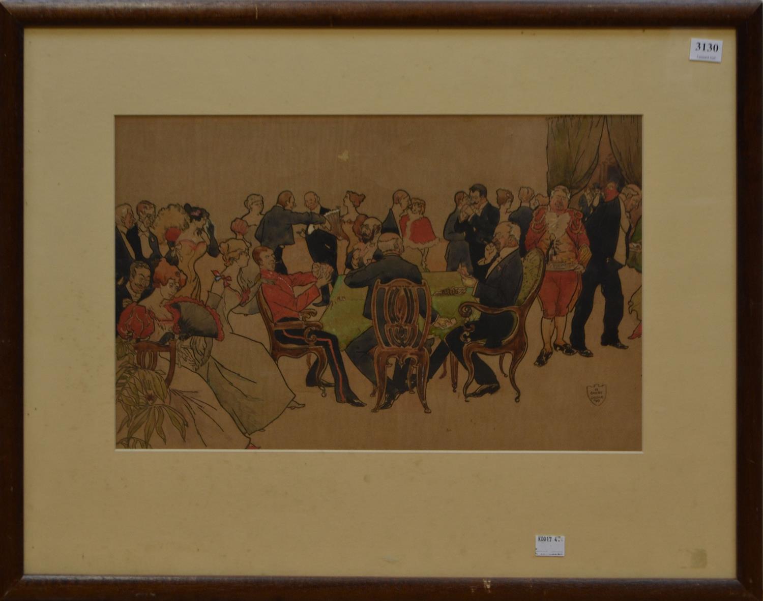 R. EMERY POOLE, THE HIGH FLYERS, WATERCOLOUR AND INK, 27 X 42CM, FRAME SIZE: 49 X 61CM, CONDITION: FOXING, WATER STAIN LOWER MIDDLE, DISCOLOURATION, PAPER LOSS UPPER MIDDLE