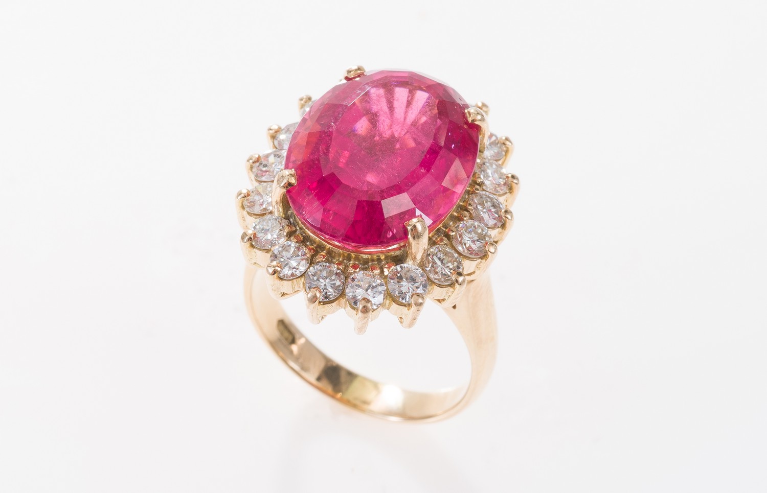 The ring presents in very good overall condition. All stones are in very good condition and are secure in their settings. Gold surfaces show only minor evidence of wear.