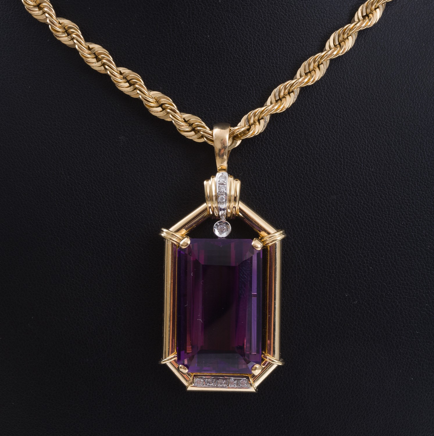 The pendant presents in excellent condition. The amethys and diamonds are all in excellent condition with very little evidence of wear. The chain also displays little evidence of wear. 37.7gms.