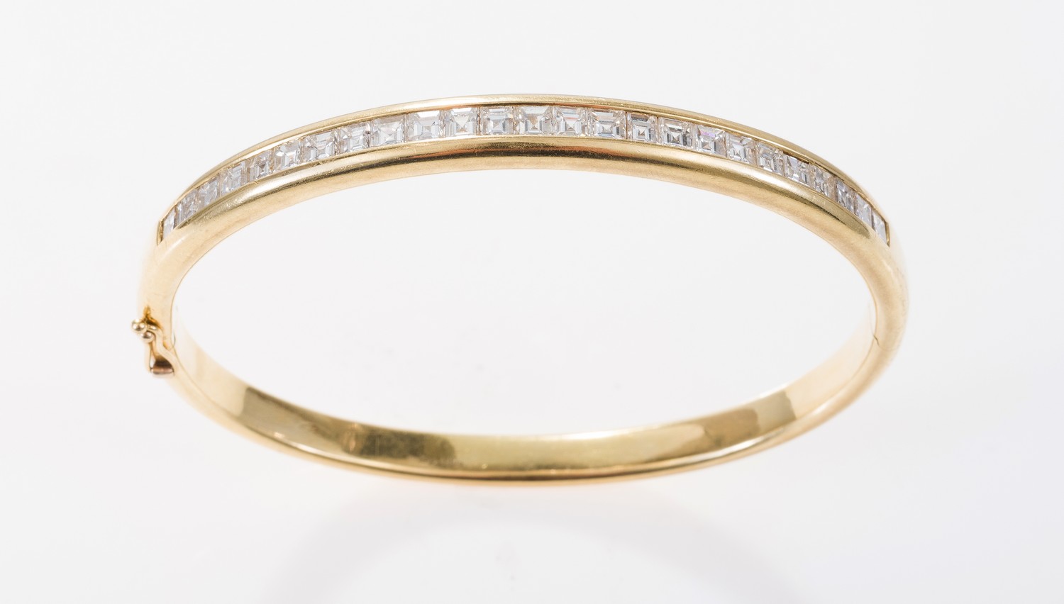 The bangle presents in very good overall condition. Diamonds are all securely set and are of a good commercial colour and clarity grade. Gold surfaces show some evidence of wear. Hinge is operational and secure when closed. Estimated total diamond weight 3.75cts.