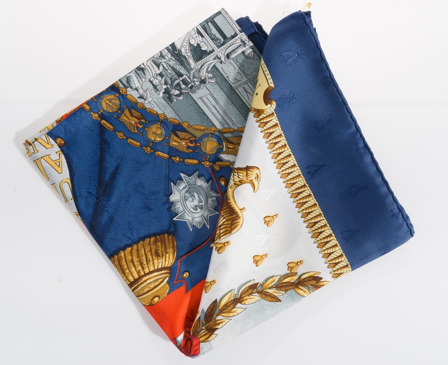 A SILK SCARF BY HERMES, THE 'NAPOLEON' DESIGN BY PHILIPPE LEDOUX, 90CM SQUARE.