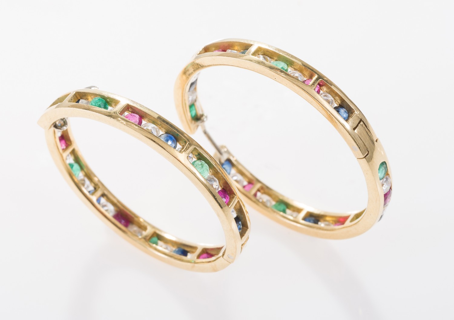 The earrings present in very good overall condition. All stones are in good condition and are secure in their settings. Diamonds are of a mid commercial clarity grade. TDW = 30 diamonds approx 3.0cts. Sapphires, rubies and emerals are all in good condition. Gold surfaces show minor wear.