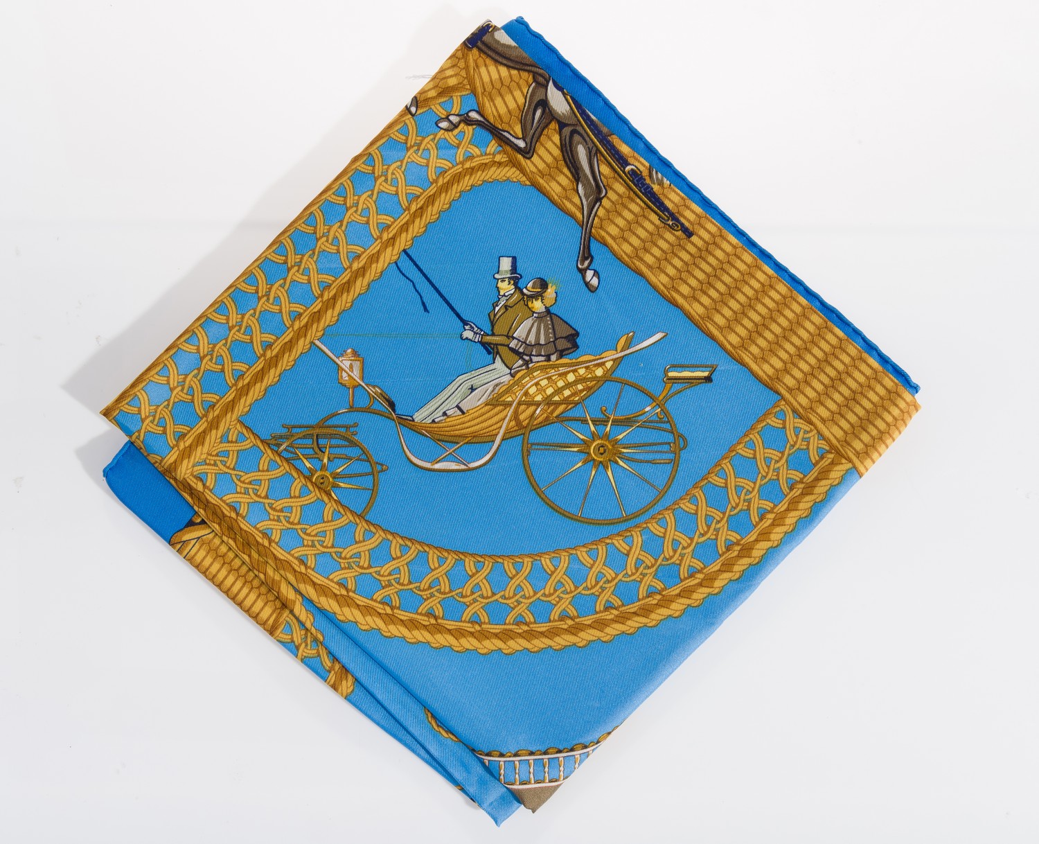 A SILK SCARF BY HERMES, THE 'VOITURES PANTIERS' DESIGN, 90CM SQUARE.