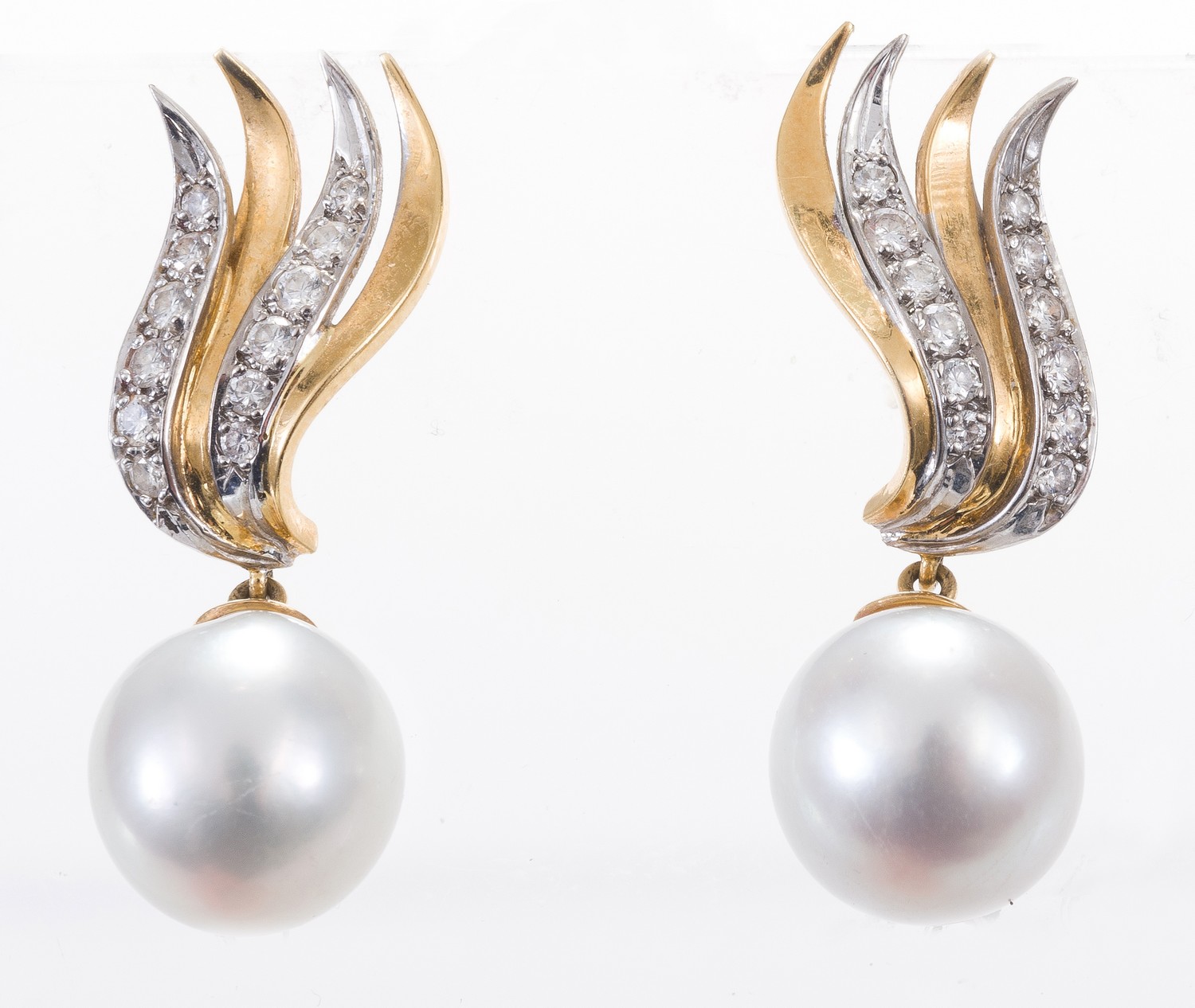The earrings present in very good condition showing some minor wear to pearls and gold surfaces. Diamonds are all in excellent condition and secure in their settings. Butterfly fittings are secure.