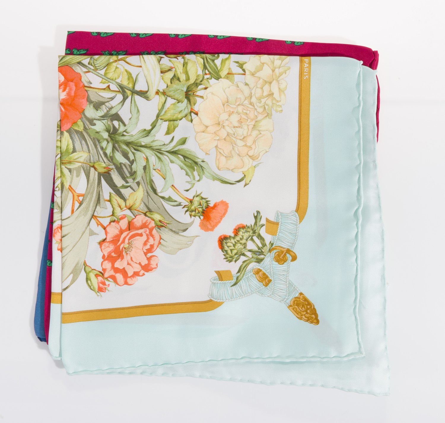 THREE SILK POCHETTES BY HERMES, INCLUDING 'REGINA' DESIGN, 42CM SQUARE.