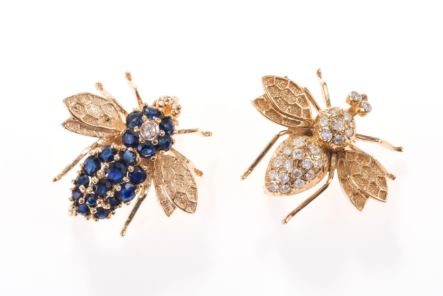 The brooches present in very good condition. All stones are in good condition and are secure in their settings. Gold surfaces are in very good condition. Clasps are secure. 7.2grams.