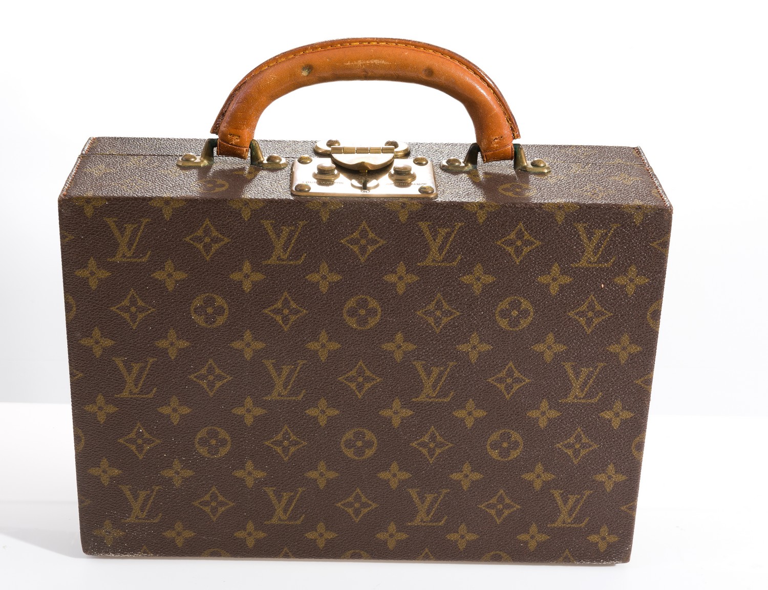 A HARD BRIEFCASE BY LOUIS VUITTON, WITH INTIALS C.C.S, Styled in monogram canvas with tan leather handle and gold metal hardware, 43...