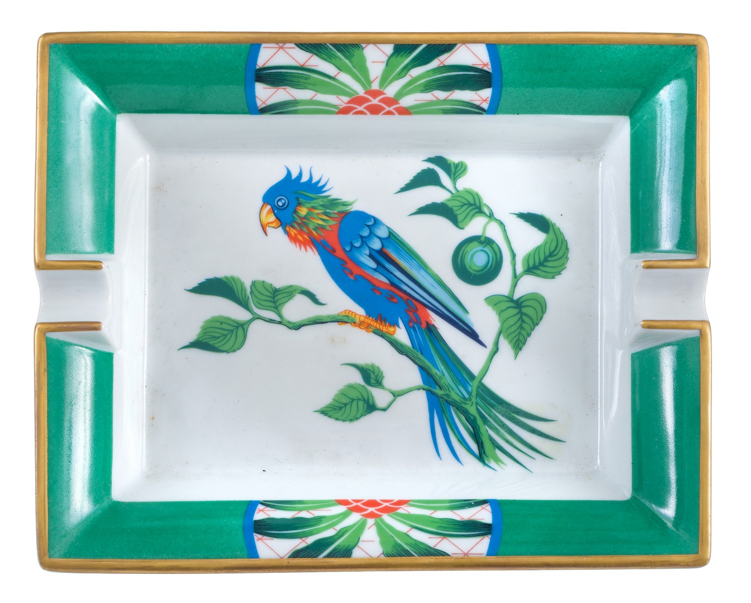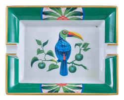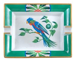 A PAIR OF ASHTRAYS BY HERMES, HAVING A TROPICAL BIRD DESIGN, 20 x 16cm.
