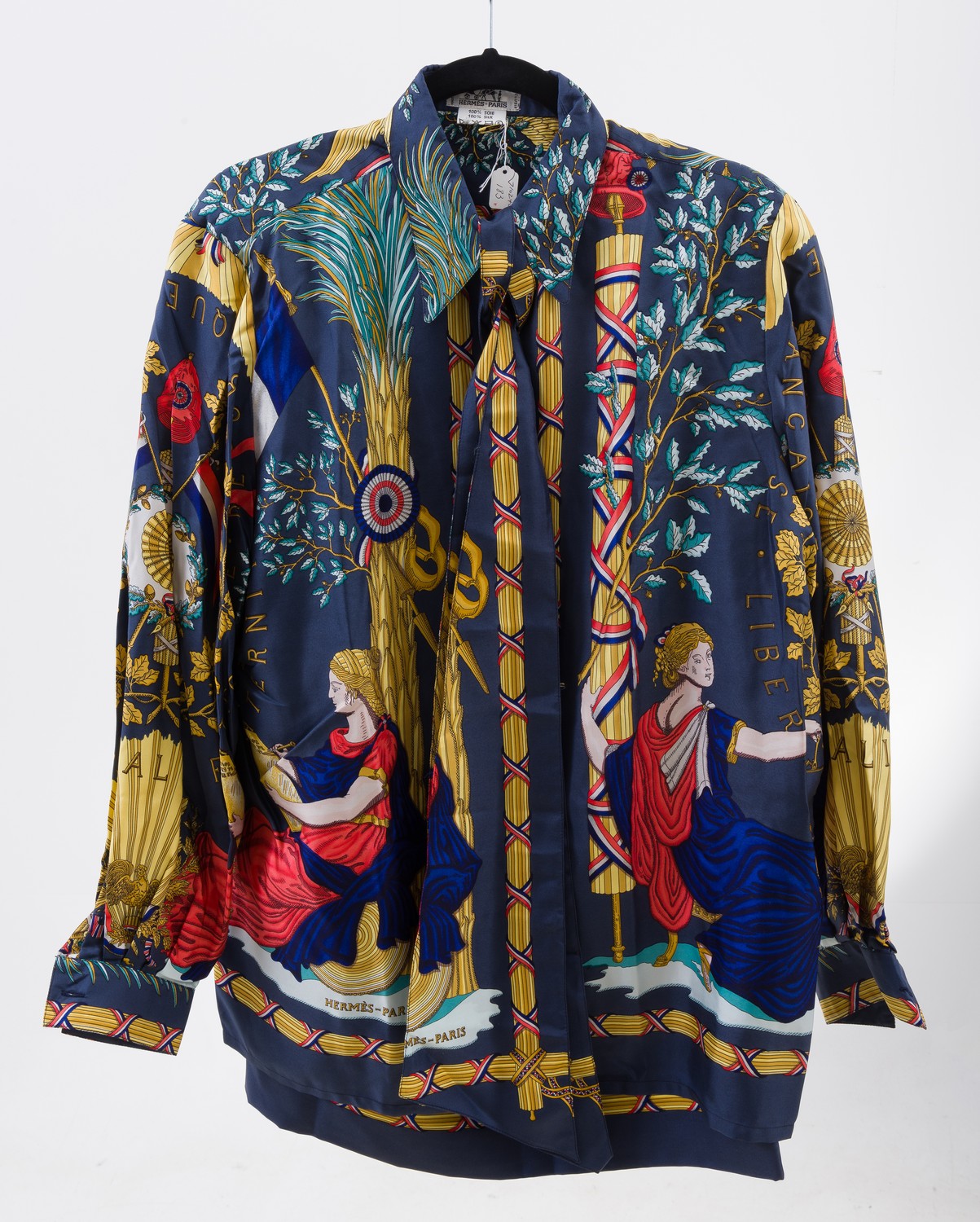 A SILK TWO PIECE SET BY HERMES, COMPRISING OF JACKET AND SKIRT , WITH MULTI-COLOURED DESIGN ON A NAVY BACKGROUND, LABELLED SIZE 46.