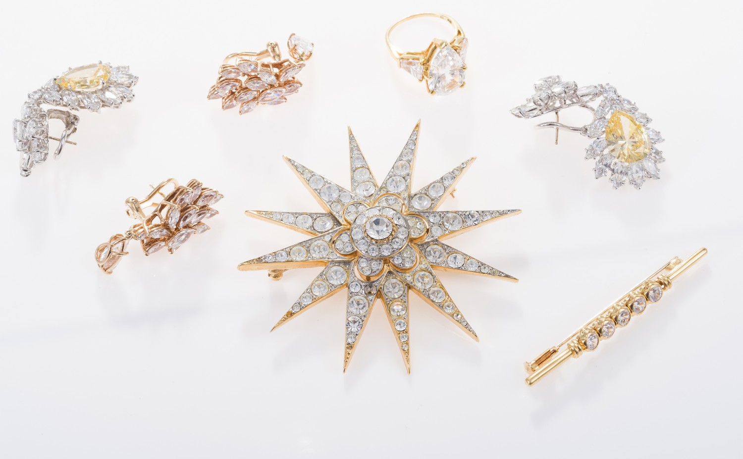 The collection presents in very good condition overall with very little evidence of wear. The exception is the starburst brooch which shows some wear and is deficient of one stone.