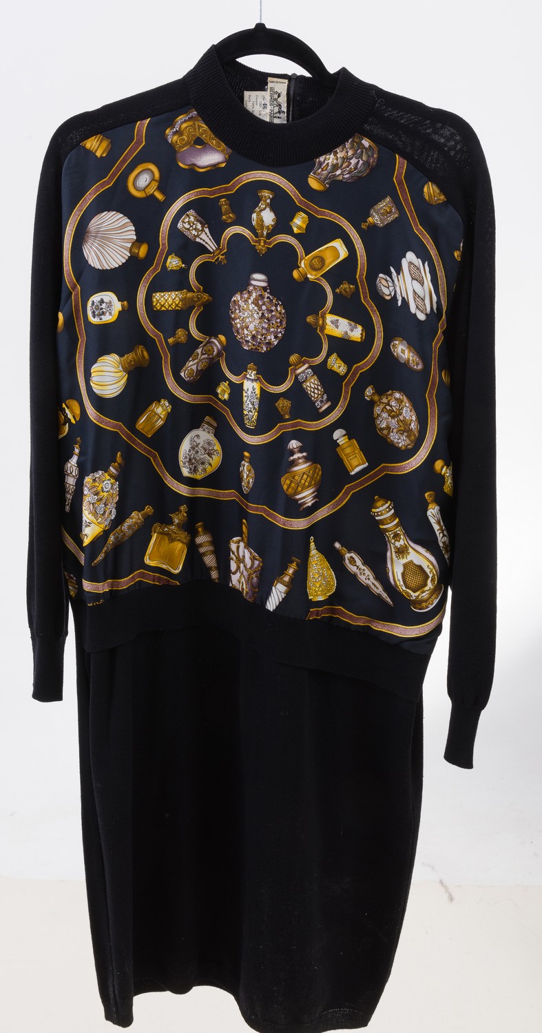 A SILK AND WOOL DRESS BY HERMES, MULTI-COLOURED DESIGN ON A BLACK BACKGROUND, LABELLED SIZE 46.