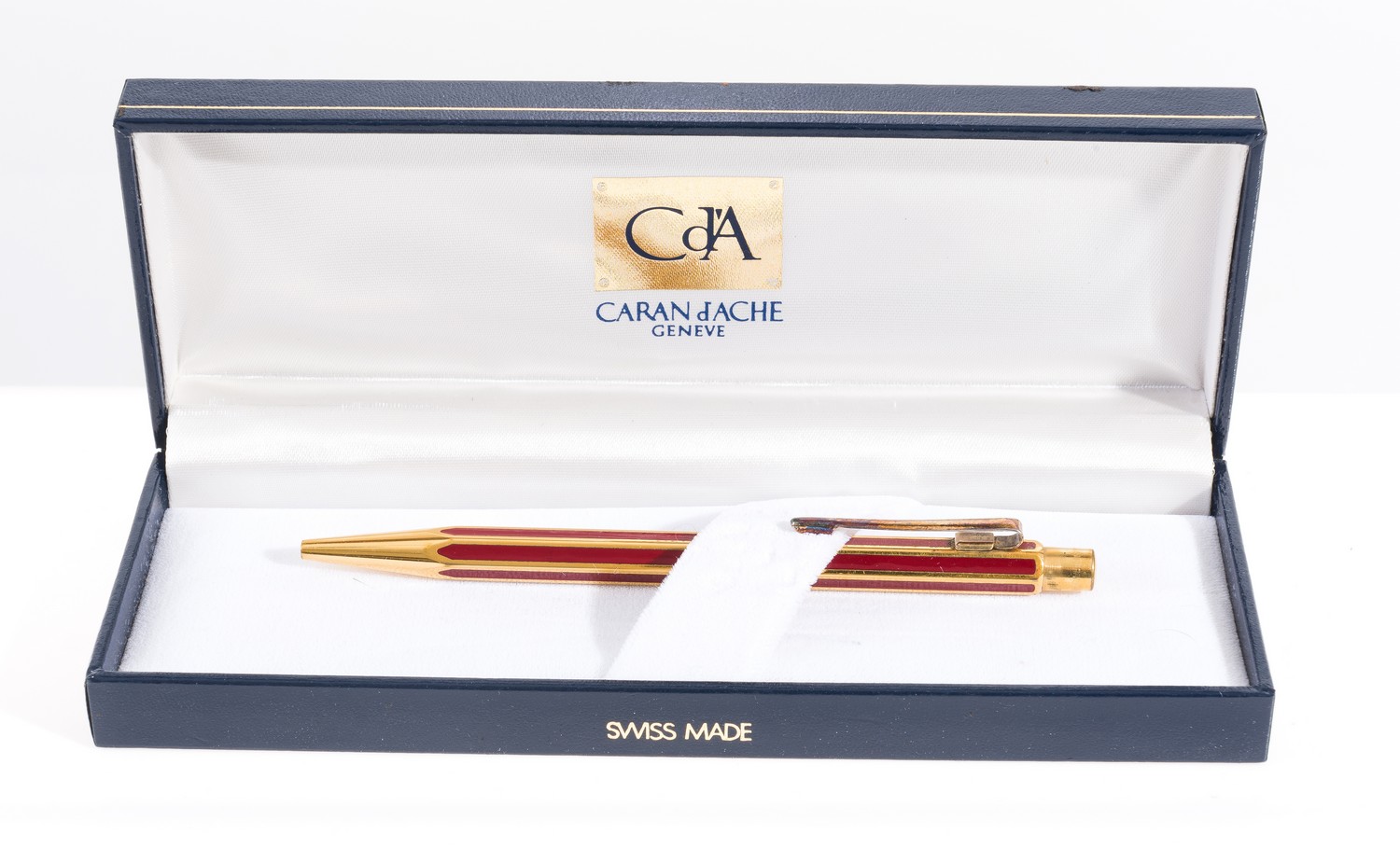 TWO ENAMELLED GOLD PLATED CARAN D'ACHE PENS, ONE IN GREEN ENAMEL AND THE OTHER IN RED, BOXED.