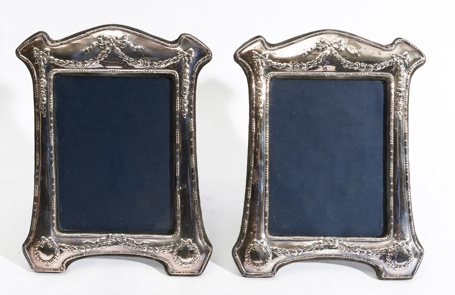 TWO LARGE STERLING SILVER FRAMES WITH RIBBON AND GARLAND EMBOSSED BORDERS