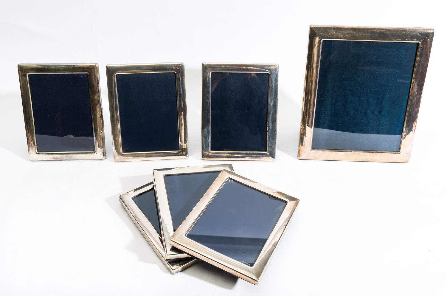 A COLLECTION OF SEVEN STERLING SILVER PHOTO FRAMES WITH PLAIN BORDERS ( GLASS MISSING TO ONE)