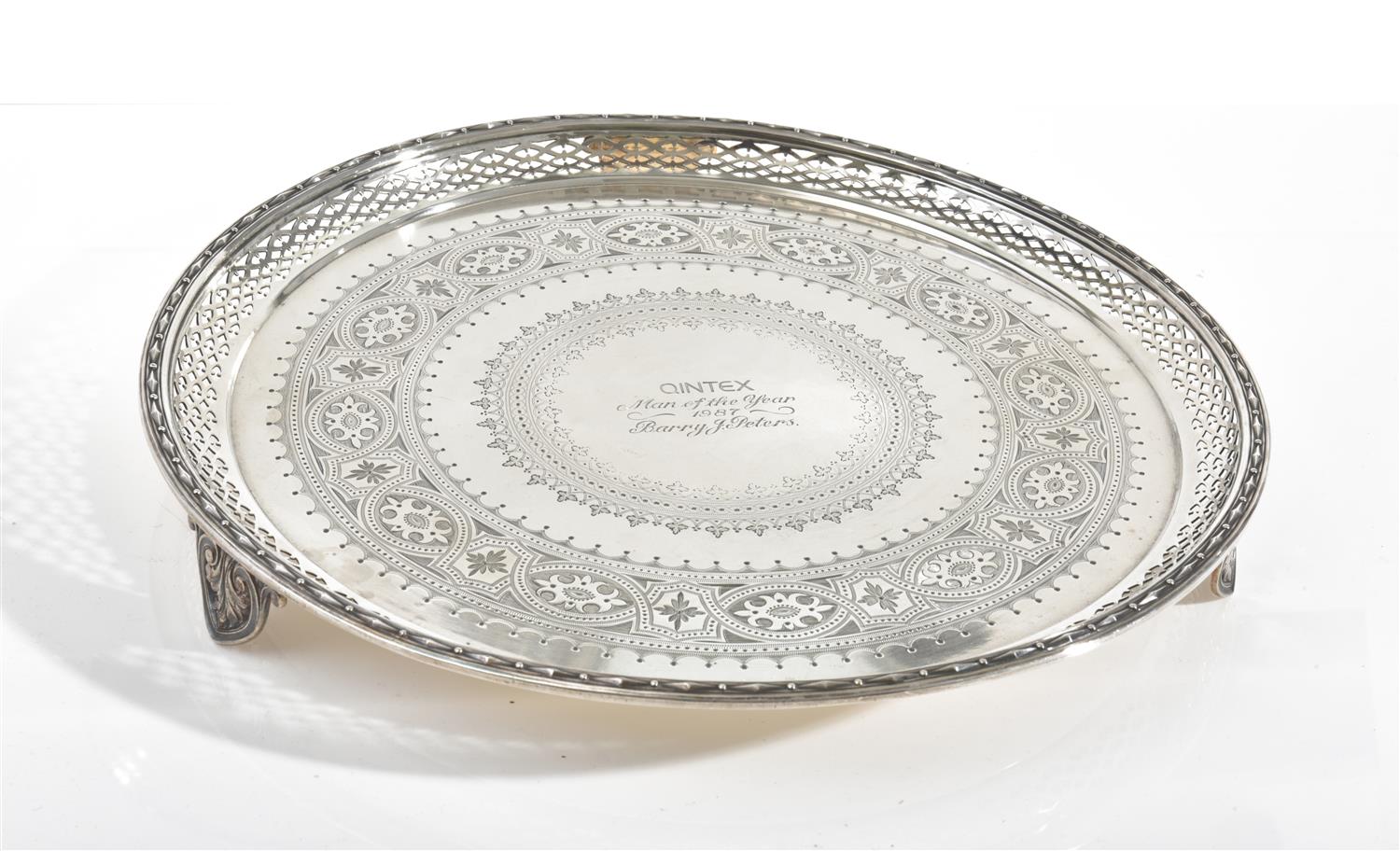 AN ENGLISH STERLING SILVER FOOTED TRAY WITH PIERCED DETAIL INSCRIBED 'QINTEX MAN OF THE YEAR 1987 BARRY J PETERS'