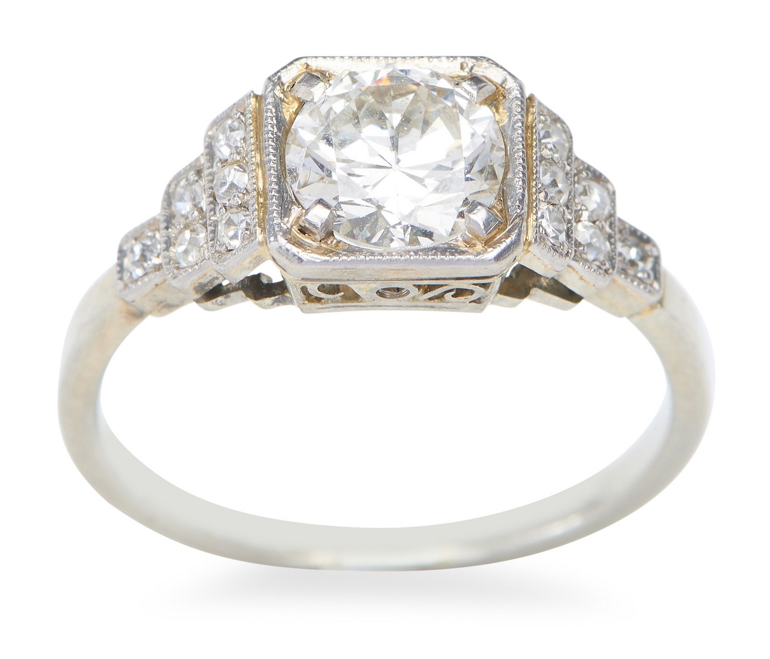 Featuring a transition cut diamond weighing an estimated 0.80cts, in a box setting within stepped shoulders set with single cut diamonds, in 18ct white gold and platinum, ring size J 1/2.