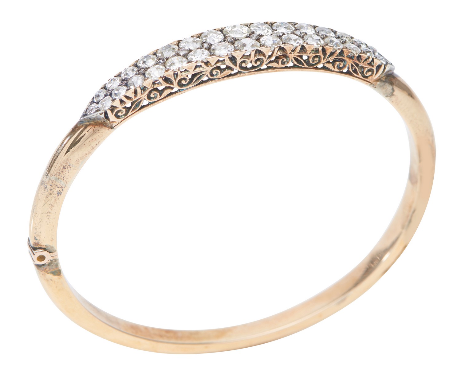 The hinged bangle comprising a double row of graduating old European cut diamonds and fine diamond detail totalling an estimated 3.70cts, in 15ct gold.
