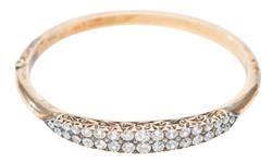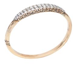 The bangle presents in good overall condition. Some minor tarnish to gold surfaces. Diamonds are all secure in their settings and are of a mid commercial clarity range. Inner diameter 62mm x 52mm.