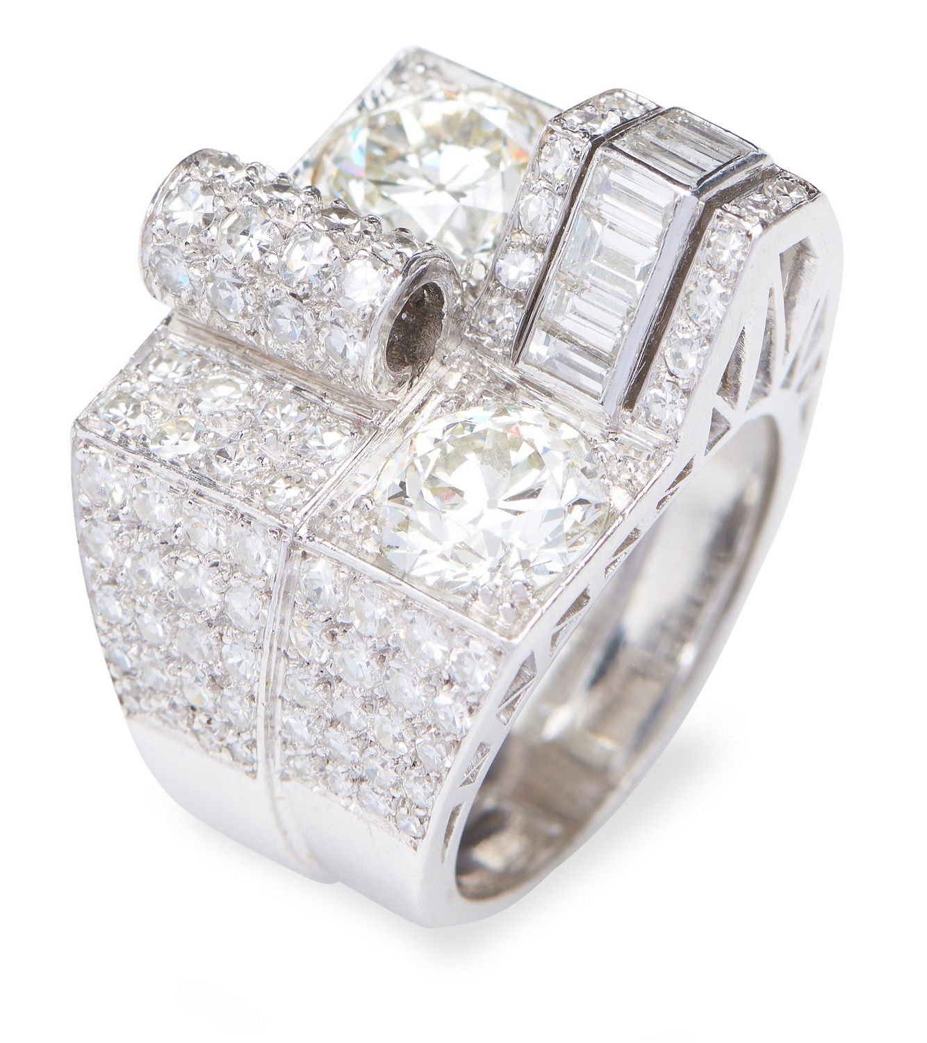 Of Retro design, featuring two old European cut diamonds weighing 1.30cts and 1.50cts respectively within a raised geometric and scrolled diamond set surround, in 18ct white gold, ring size K.