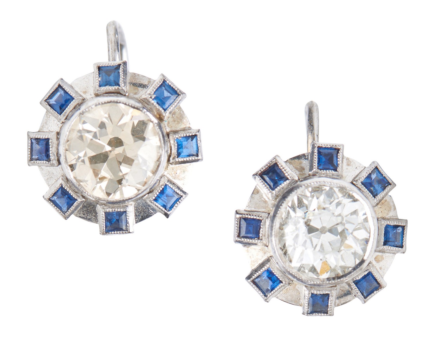 Each circular plaque centred with an old European cut diamond weighing 1.25cts and 1.36cts respectively, within a geometric border set with carré cut sapphires, to screw back fittings in platinum and 18ct white gold.