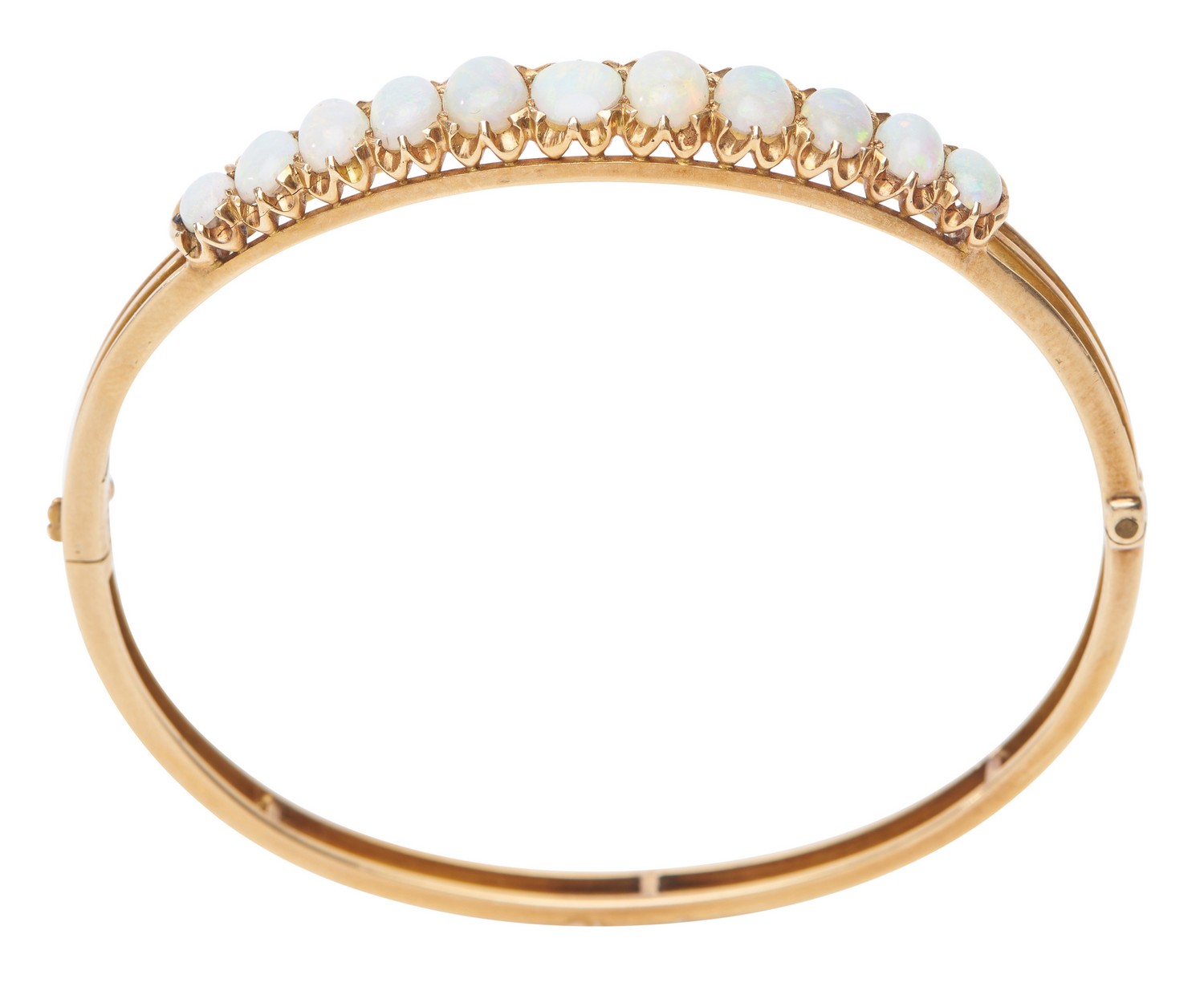 The hinged bangle comprising eleven graduating oval opals, in 15ct gold.